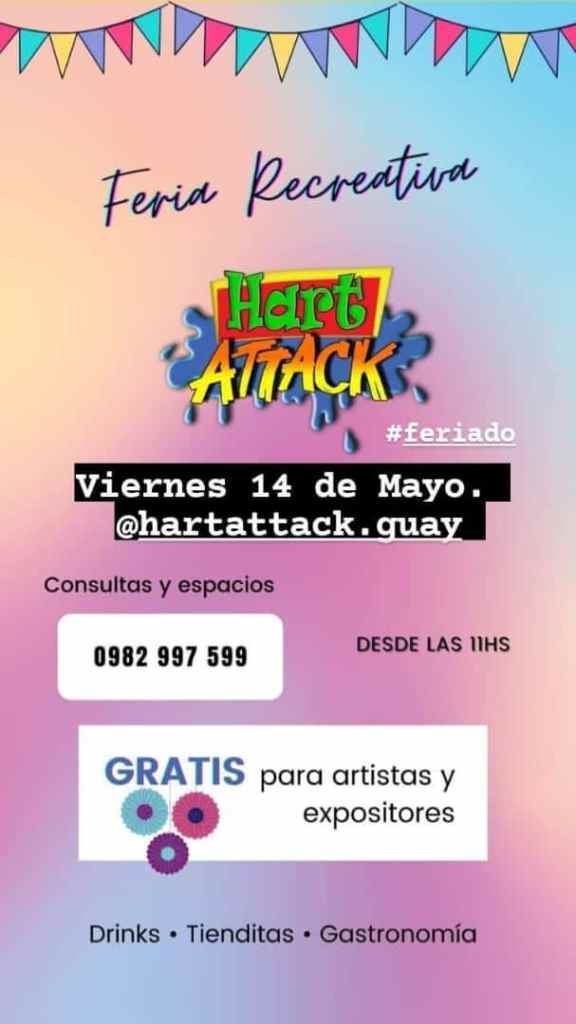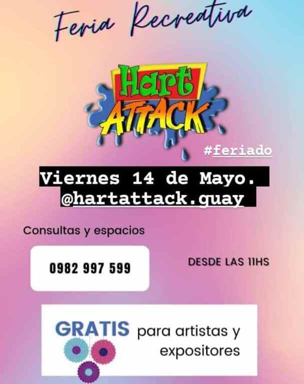El viernes 14 de mayo, a partir de las 11:00, tendrá lugar la Feria Recreativa en Hart Attack (Tte. Alcorta 156, Asunción). Este espacio está abierto para feriantes que deseen exponer sus creaciones y productos. Se tomarán todos los cuidados de higiene y seguridad de acuerdo al protocolo sanitario por covid.