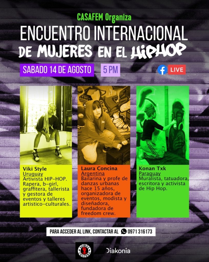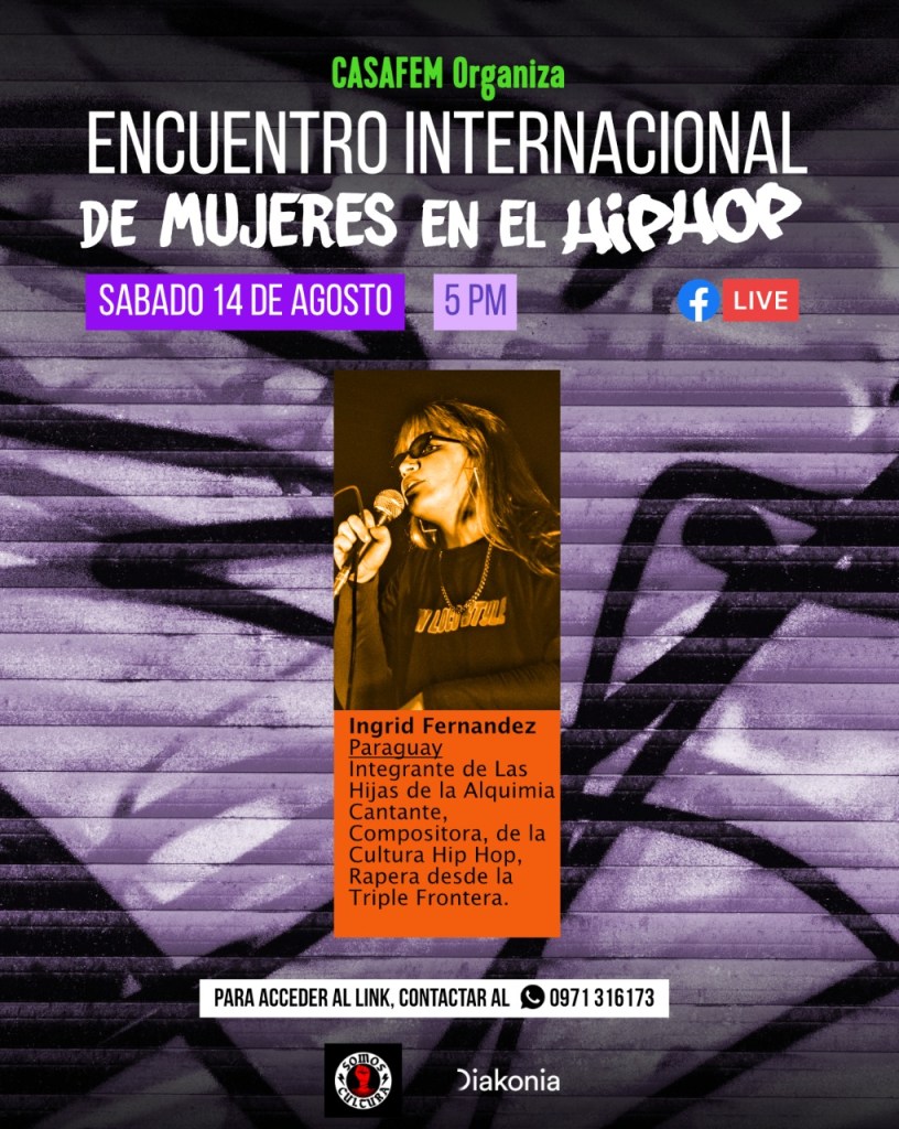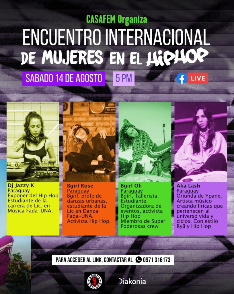 El espacio contra cultural feminista anti-imperialista y anticolonial CasaFem, organiza el Encuentro Internacional de Mujeres en el Hip Hop. El evento se realizará este sábado 14 de agosto a las 17:00 (hora paraguaya), vía Facebook Live en la cuenta de CasaFem en Facebook.