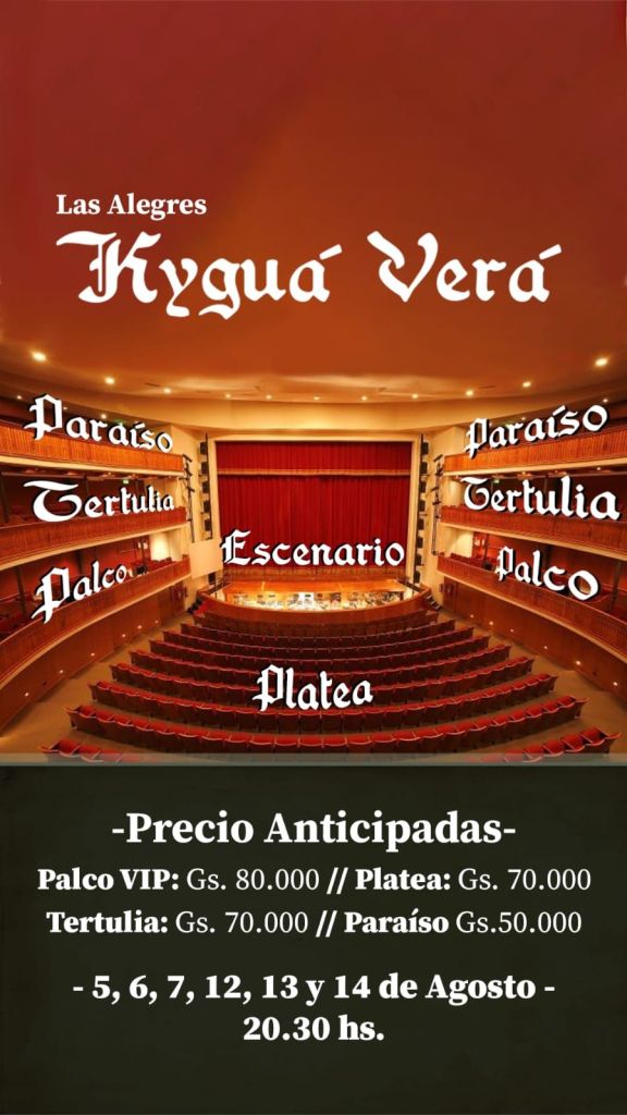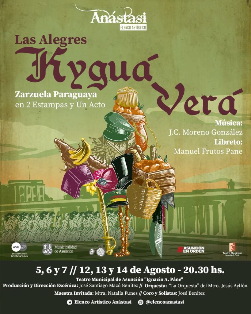 El elenco Artístico Anástasi de la mano de ArtVita y La Orquesta presentan la obra“Las Alegres Kyguá Verá” de Juan Carlos Moreno González y Manuel Frutos Pane. Se trata de una Zarzuela Paraguaya en dos Estampas y un Acto. Las funciones serán los días Viernes 5, Sábado 6 y Domingo 7, Viernes 12, Sábado 13 y Domingo 14 de Agosto a las 20:30 hs en el Teatro Municipal de Asunción “Ignacio A. Pane”.