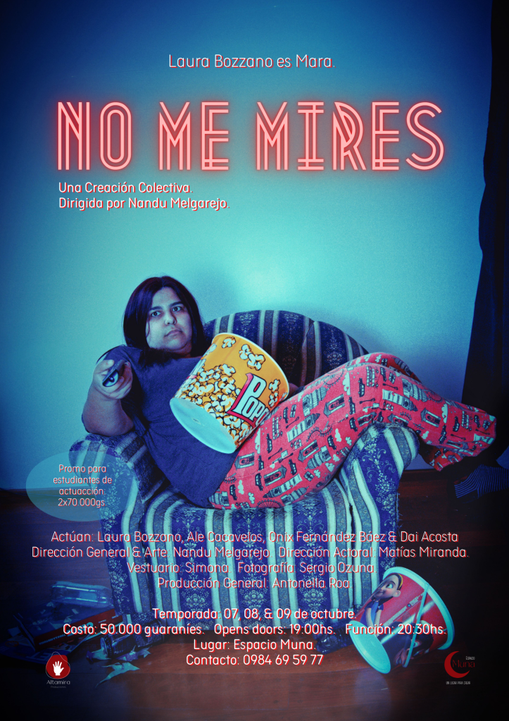 Los dias 7, 8 y 9 de octubre se presentará en el Espacio Muna la pieza teatral de creación colectiva «No me mires«. Las entradas cuestan 50mil gs y tiene un costo promocional para estudiantes de actuación de 2 x 70mil gs. Open doors: 19:00 hs Función: 20:30 hs