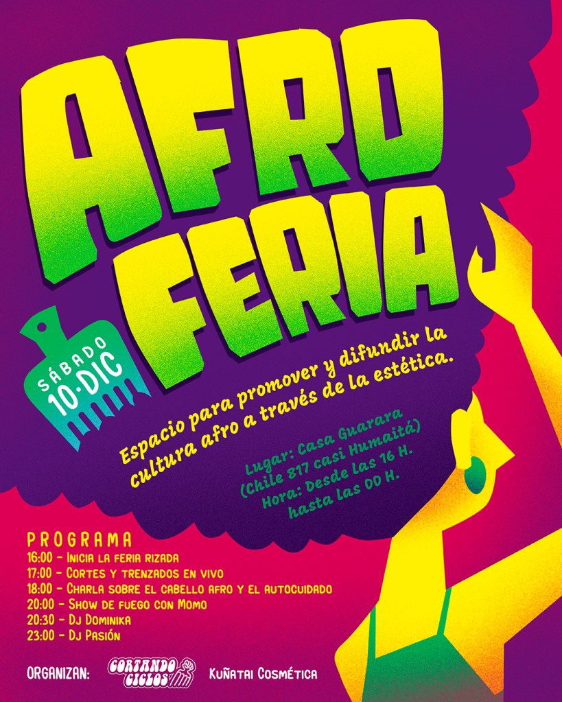 Afro Feria Py, es un espacio que nació con el objetivo de promover y difundir la cultura afro a través de la estética. La primera edición de este evento se llevará a cabo el próximo sábado 10 de diciembre desde las 16:00 hs en Casa Guarará (chile 817 casi humaitá). La entrada es libre y gratuita.