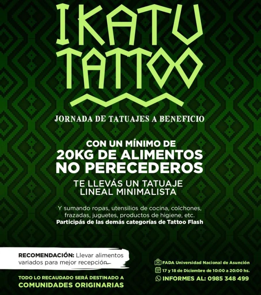 Hay una larga lista de familias que este año perdieron todo durante injustos desalojos y otras en total abandono del estado. Ante esta situación, un grupo de tatuadores se junta para realizar este fin de semana una jornada de tatuajes a beneficio. El evento que lleva por nombre IKATU TATTOO se desarrollará este sábado 17 y domingo 18 de diciembre en el local de la FADA (universidad nacional de asunción) de 10:00 a 20:00 hs.