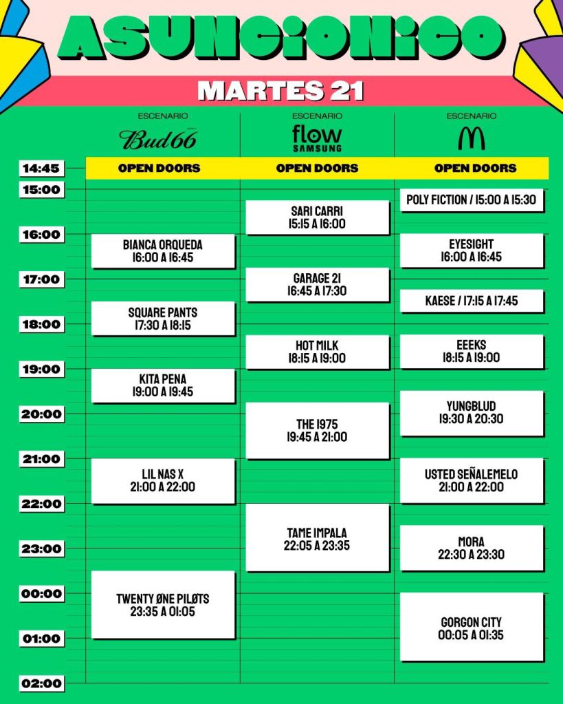 El DÍA 1 de la edición 2023 de Asunciónico se encuentra actualmente encabezado por la el explosivo dúo americano; TWENTY ONE PILOTS, así como TAME IMPALA, el proyecto de música psicodélica del multiinstrumentista australiano Kevin Parker. Se destaca además la presencia de LIL NAS X junto a THE 1975 y MORA, completando este primer gran día GORGON CITY, YUNGBLUD, USTED SEÑALEMELO, HOT MILK y con la bandera paraguaya bien en alto: KITA PENA, EEKS, SQUARE PANTS, GARAGE 21, EYESIGHT, BIANCA ORQUEDA, POLY FICTION, KAESE y SARI CARRI.