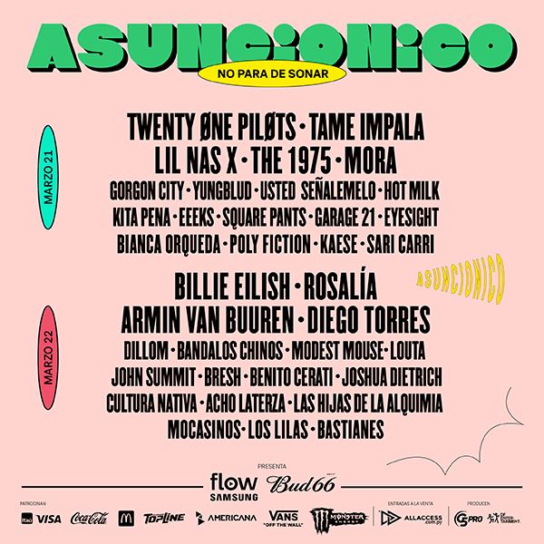 Las entradas siguen en venta en etapa de preventa 4 en todos los locales oficiales y adheridos. Asunciónico; es presentado por Flow, Samsung y Bud66 y se prepara para su nueva edición el 21 y 22 de marzo en el Parque Olímpico (Acceso Ñu Guazú).