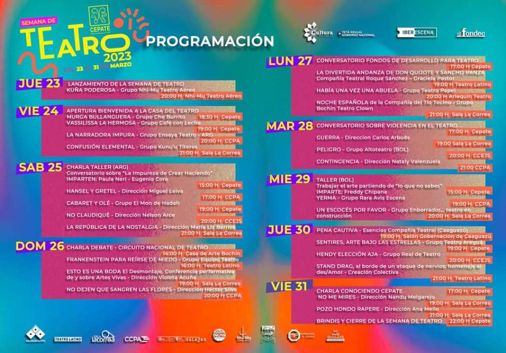 Con la presencia de elencos nacionales e internacionales, el Centro Paraguayo de Teatro, CEPATE, anunció las fechas de la Semana de Teatro 2023. La misma se llevará a cabo del 23 al 31 de marzo en varios escenarios, salas de teatro, espacios alternativos y centros culturales de asunción y el interior.