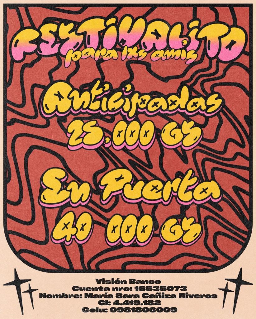 El costo de las entradas anticipadas es de 25.000 gs (por transferencia bancaria) y en puerta costarán 40.000 gs. (Efectivo o transferencia bancaria)
