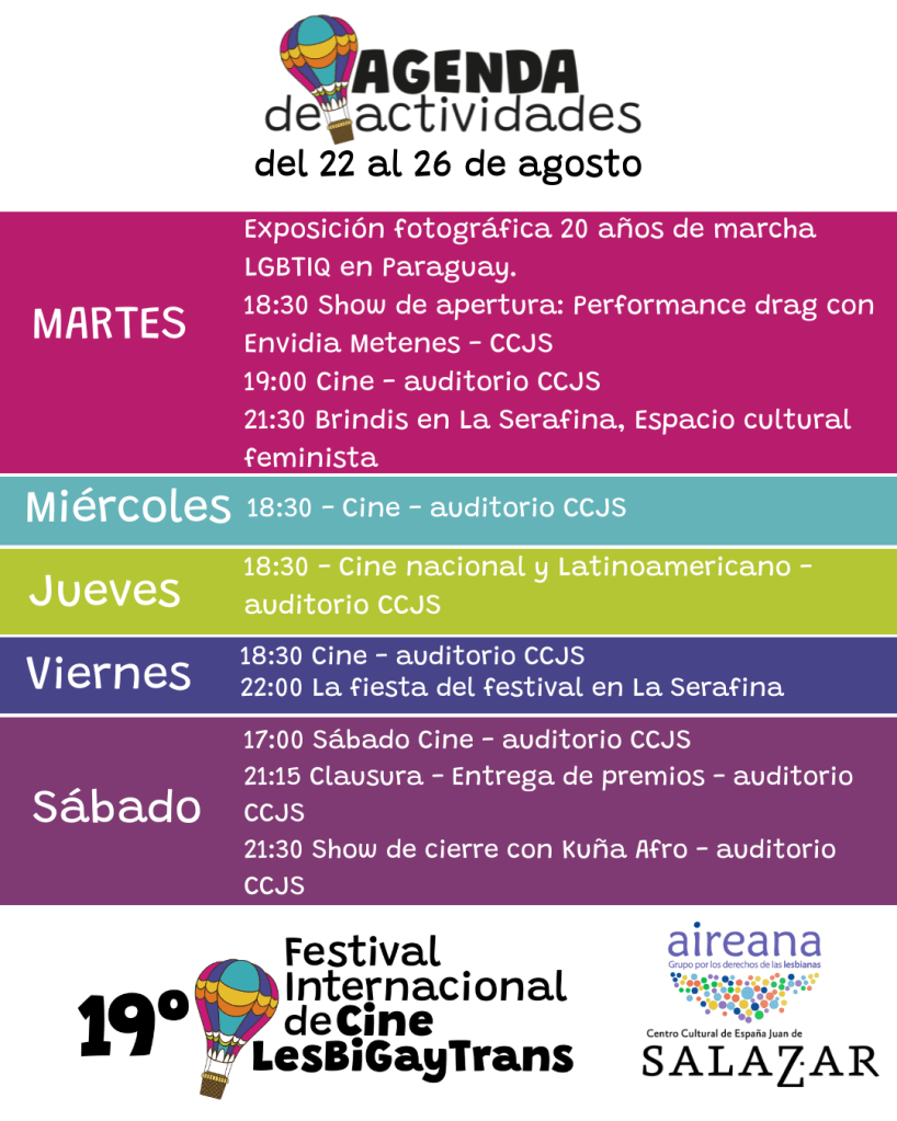 Un pequeño pedazo del mundo se podrá disfrutar del 22 al 26 de agosto cuando el Centro cultural de España Juan de Salazar abra sus puertas para celebrar una edición más del festival internacional de cine LesBiGayTrans que es organizado por Aireana, grupo por los derechos de las lesbianas.