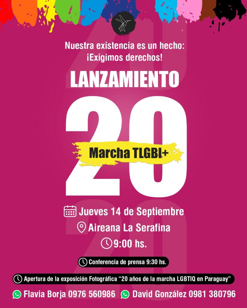 Con el lema “Nuestra existencia es un hecho: ¡Exigimos derechos!”, anuncian la realización de la 20° Marcha por los derechos de las Personas TLGBI+ del Paraguay, cuyos detalles se darán a conocer este jueves 14 a las 9 de la mañana en Aireana La Serafina (Eligio Ayala 907), durante una conferencia de prensa.