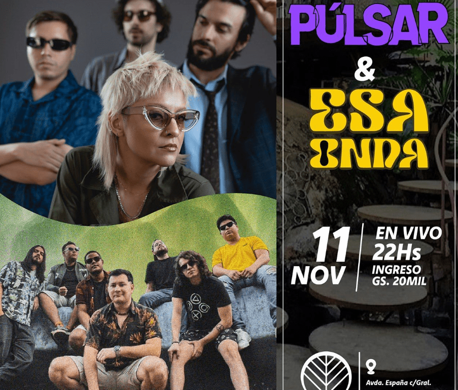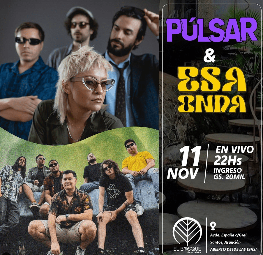 Las bandas locales «Púlsar» y «Esa Onda«, se juntan para compartir escenario compartirán escenario en el Bosque de los Artistas (Avda. España casi Gral. Santos) este sábado 11 de noviembre desde las 22:00 hs. Ingresos 20mil gs.