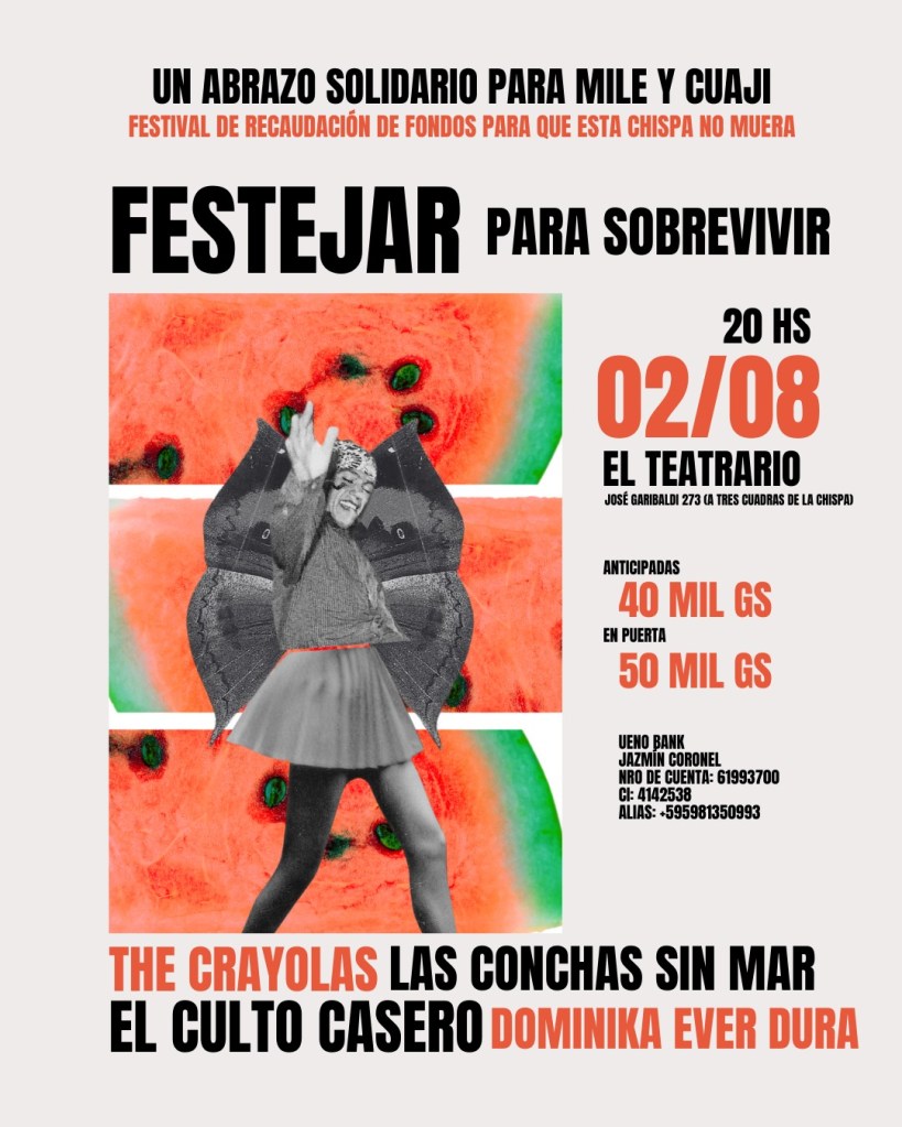 El Culto Casero, Las Conchas sin Mar y The Crayolas son las bandas que lideran este evento, acompañados por los djs Dominika y Ever Dura, que se unieron a la causa que busca el apoyo de toda la comunidad del espacio cultural. La entrada al evento es de G. 50.000.
