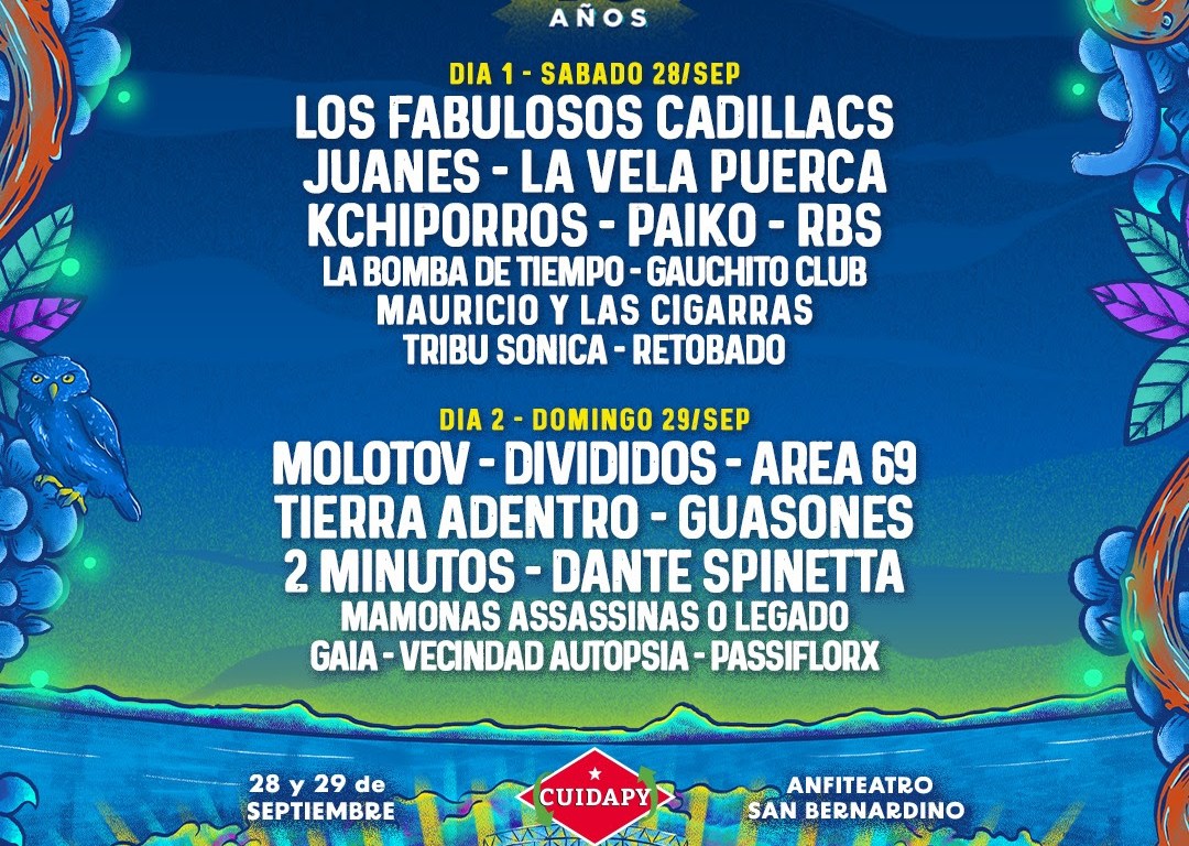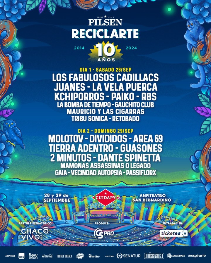 El primer día de la edición 2024 de Pilsen ReciclArte se encuentra encabezado por la consagrada banda de rock latino (grandes referentes de la escena con un legado musical indiscutible); LOS FABULOSOS CADILLACS, junto a la inigualable energía del cantante, compositor y músico colombiano JUANES y la potente banda de rock uruguaya; LA VELA PUERCA. Se suman a esta fecha los indiscutibles mayores exponentes de la escena local: KCHIPORROS, PAIKO y RBS. Y desde Argentina: LA BOMBA DE TIEMPO y GAUCHITO CLUB. Completan el primer día: MAURICIO Y LAS CIGARRAS, TRIBU SONICA y RETOBADO.