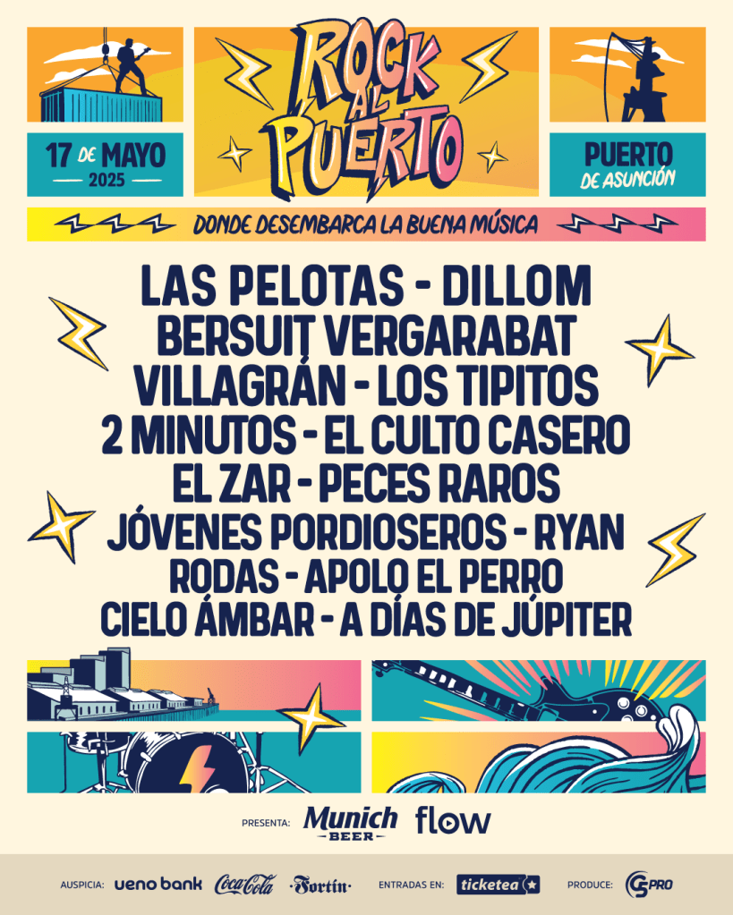 El próximo 17 de mayo, un nuevo festival llega a la capital del país: ROCK AL PUERTO desembarca en Asunción para transformar el emblemático Puerto de la ciudad en un epicentro musical. El festival reunirá a los fanáticos del género, con una grilla de artistas que ofrecerá una experiencia única en dos escenarios, vistas espectaculares del río Paraguay y la ciudad, todo en un ambiente vibrante que promoverá la responsabilidad sociocultural y conectará a la comunidad a través de sus artistas favoritos.