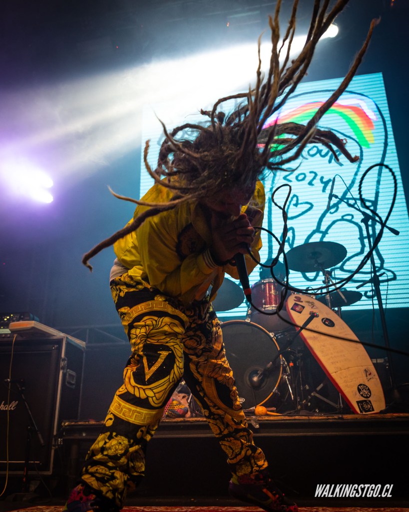 Su tono de voz, alto y personal puede llegar desde lo grave más gutural hasta los agudos más difíciles de alcanzar, como también el idioma con el que canta, de creación propia salsa de slangs llamado “tum tum lunfardo”. Quienes hayan asistido a sus shows recuerdan la energía que desprende, revitalizando la escena con cada movimiento en el escenario y haciendo de las suyas con su ya famoso crowsurfing.