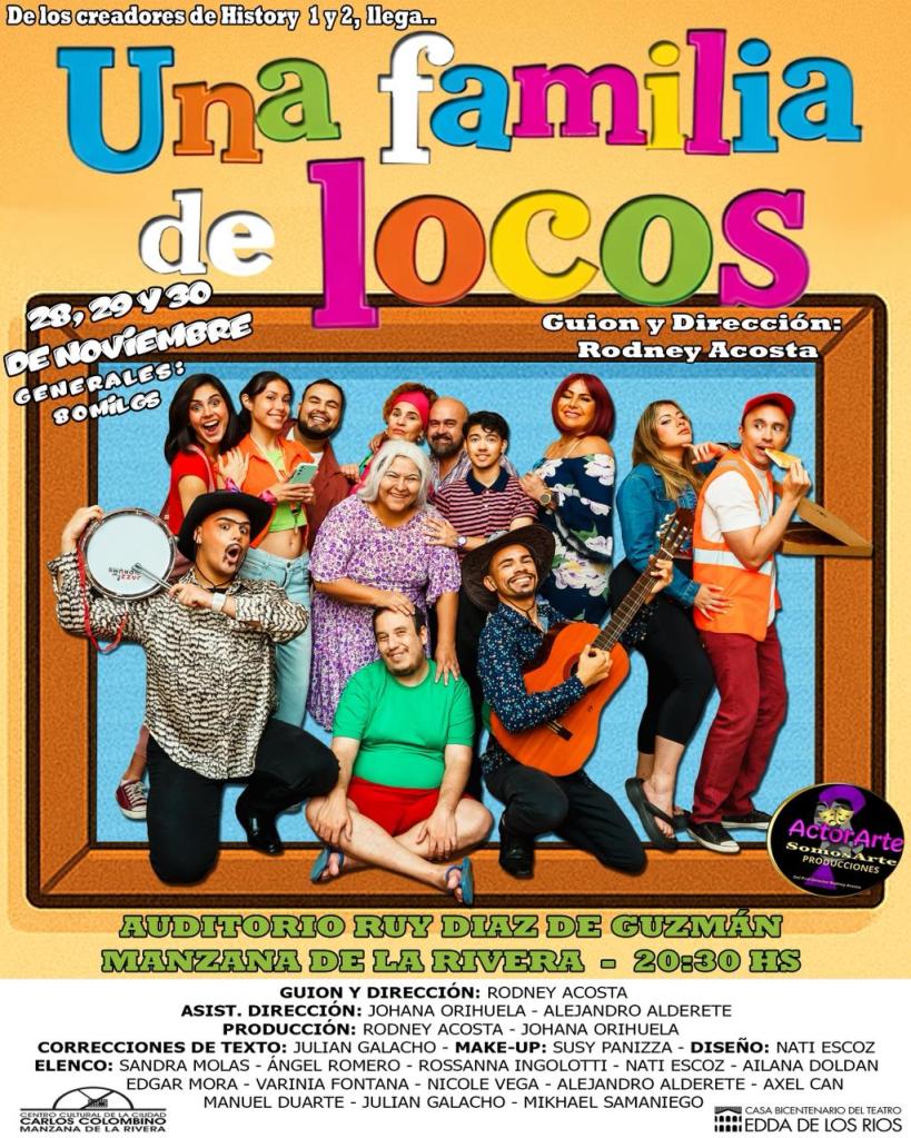 El elenco de ACTORARTE presenta UNA FAMILIA DE LOCOS, propuesta del Actor y Director Rodney Acosta, una obra teatral humorística y con una historia desopilante que gira entorno de la Abuela de la familia con ganas de contar algo a sus familiares que conviven con ella, pero que en el medio pasan situaciones cotidianas e inesperadas haciendo demorar el anuncio de su gran noticia.