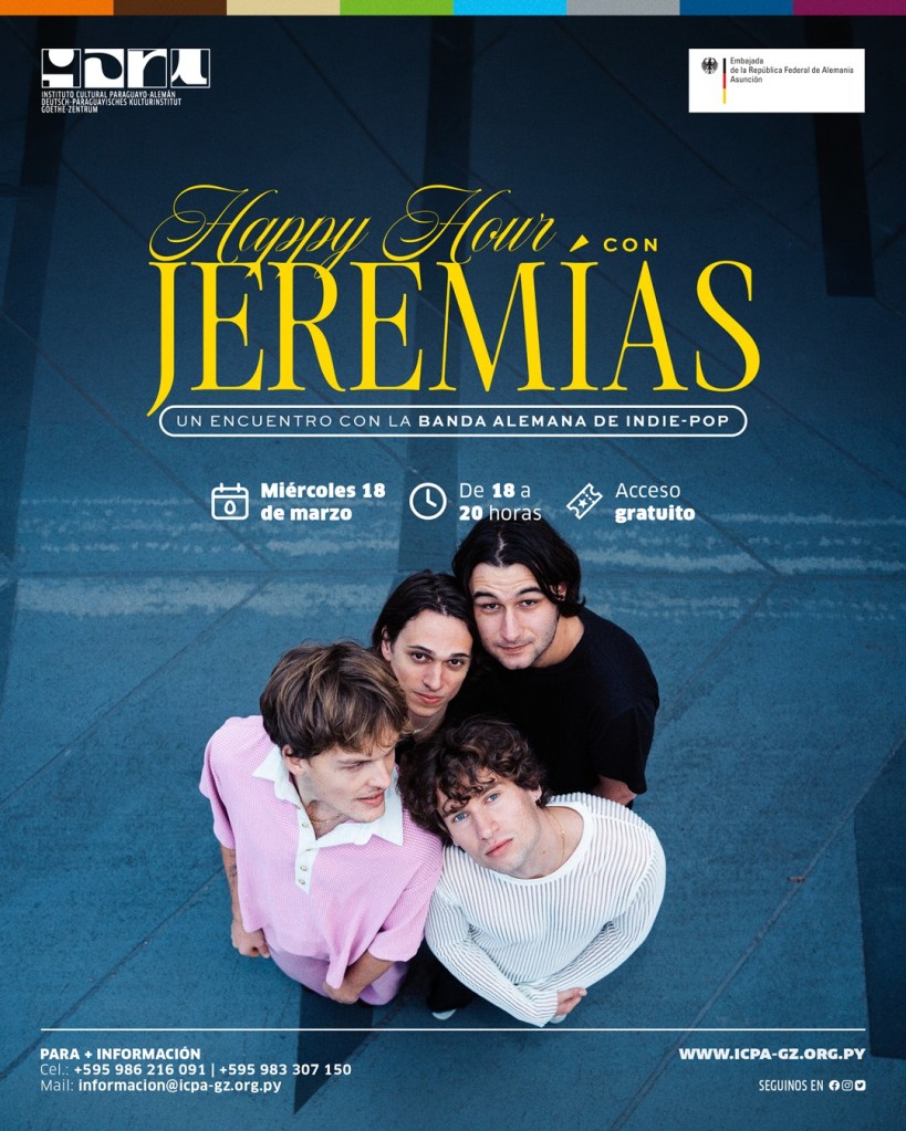 Jeremías, la exitosa banda alemana de indie-pop, ofrecerá un espacio de encuentro y happy hour el día 18 de marzo en el Instituto Cultural Paraguayo-Alemán, de 18 a 20 Hs, con acceso gratuito. El grupo llega al país con entradas agotadas para sus conciertos.
