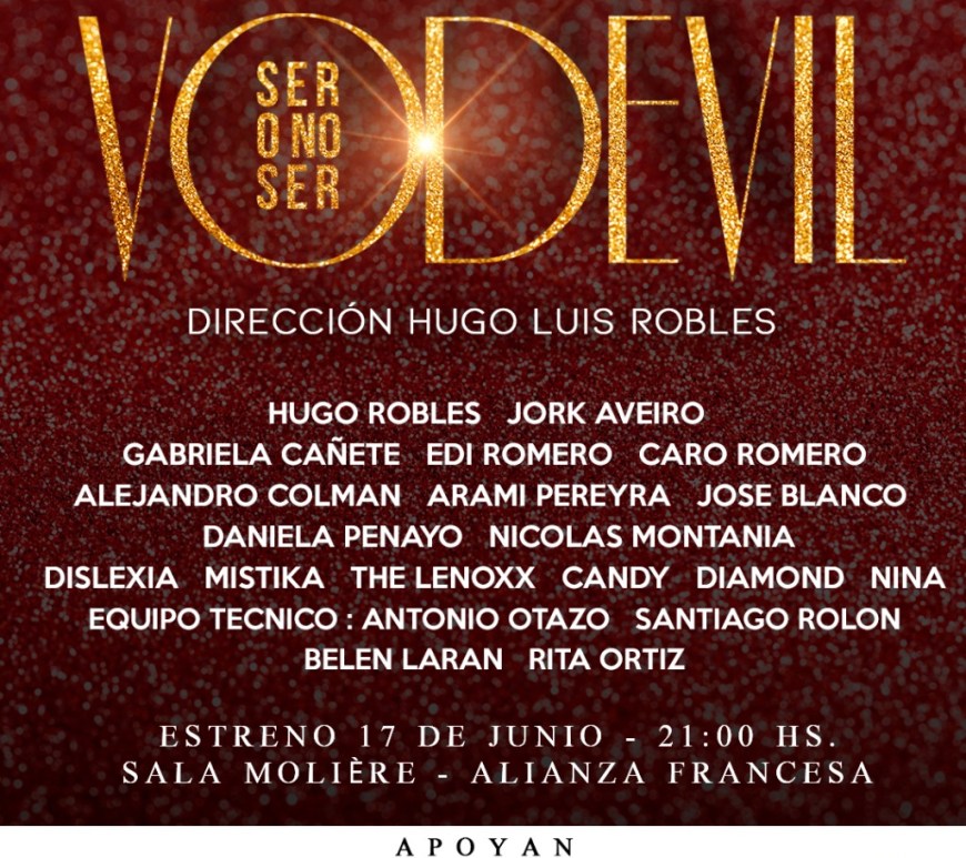 Este viernes 17 de junio a las 21:00 se estrena en la Sala Moliére de la Alianza Francesa (Mariscal Estigarribia 1039) la obra “Ser o no ser VODEVIL” de Hugo Luis Robles. Se trata de un show multidisciplinario, con un elenco de 16 artistas en escena. Con canto, baile, acrobacias y mucho humor esta propuesta celebra el orgullo con la alegría de ser quienes somos. … Continúa leyendo Ser o no ser VODEVIL