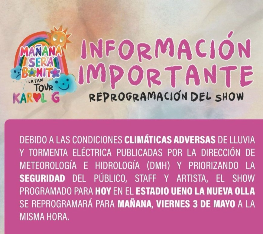 Debido a las condiciones climáticas adversas de lluvia y tormenta eléctrica publicada por la Dirección de Meteorología e Hidrología (DMH) y priorizando la seguridad del público, staff y artista, el show programado para hoy en el Estadio Ueno La Nueva Olla se reprograma para mañana, viernes 3 de mayo. Todos los tickets para la función de hoy seguirán siendo válidos para el show de mañana. Para obtener más … Continúa leyendo KAROL G EN PARAGUAY – SHOW SE REPROGRAMA PARA VIERNES 3 DE MAYO