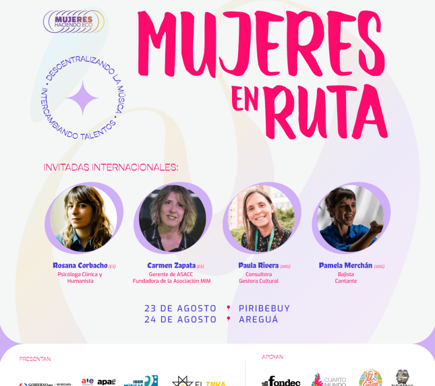 Este 23 y 24 de agosto, en las ciudades de Piribebuy y Areguá, se llevará a cabo Mujeres en Ruta, un evento único que reunirá a mujeres y disidencias de la industria musical para compartir conocimientos, crear en conjunto y transformar la música desde adentro. Durante dos días, viviremos un espacio dedicado a la reflexión, la profesionalización y la creación artística, con la participación de … Continúa leyendo Mujeres en Ruta: Descentralizando la Música y Fomentando el Intercambio de Talentos